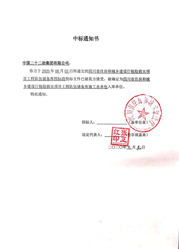 2020年8月9日,中國二十二冶集團(tuán)有限公司成都分公司收到四川省住房和城鄉(xiāng)建設(shè)廳“四川省住房和城鄉(xiāng)建設(shè)廳搶險救災(zāi)項目工程隊伍儲備庫”項目中標(biāo)通知書,這標(biāo)志著成都公司正式進(jìn)入四川省住房和城鄉(xiāng)建設(shè)廳搶險救災(zāi)項目工程隊伍儲備庫(施工總承包單位)。